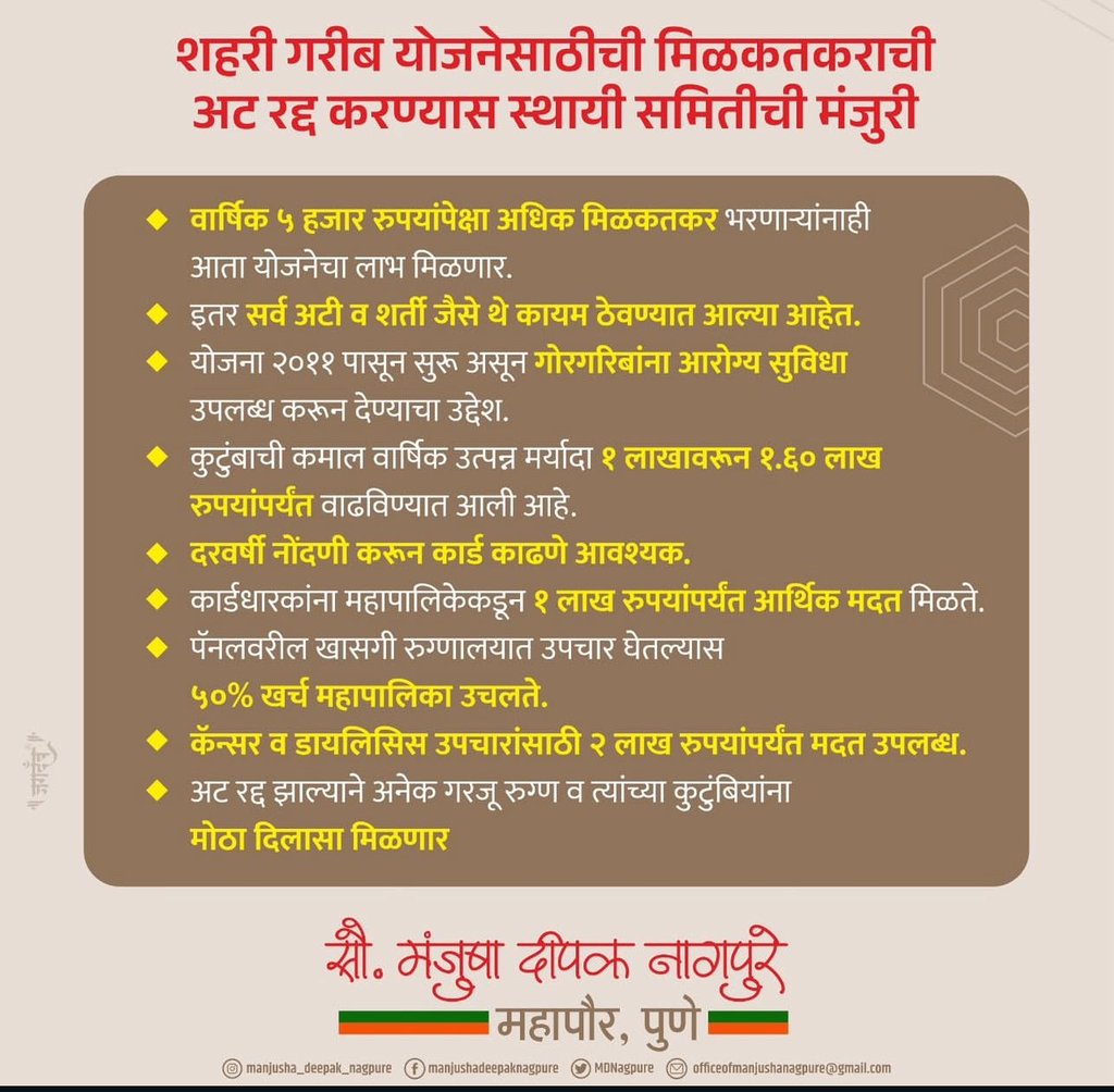 “शहरी गरीब नागरिकांना दर्जेदार आणि वेळेवर आरोग्य सेवा मिळावी, हा आमचा प्रामाणिक प्रयत्न आहे. मिळकतकराची अट रद्द केल्यामुळे अधिक गरजू कुटुंबांना योजनेचा लाभ मिळेल. आरोग्यसेवा सर्वसामान्यांच्या दारापर्यंत पोहोचवणे हे आमचे ध्येय आहे.”